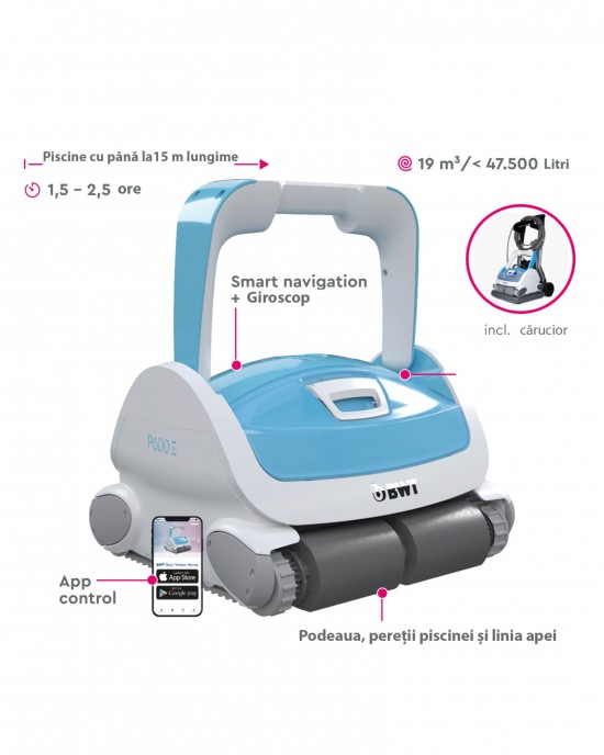 Robotul BWT D600 APP Control este echipat cu un cărucior de transport (inclus în livrare) care este foarte practic.